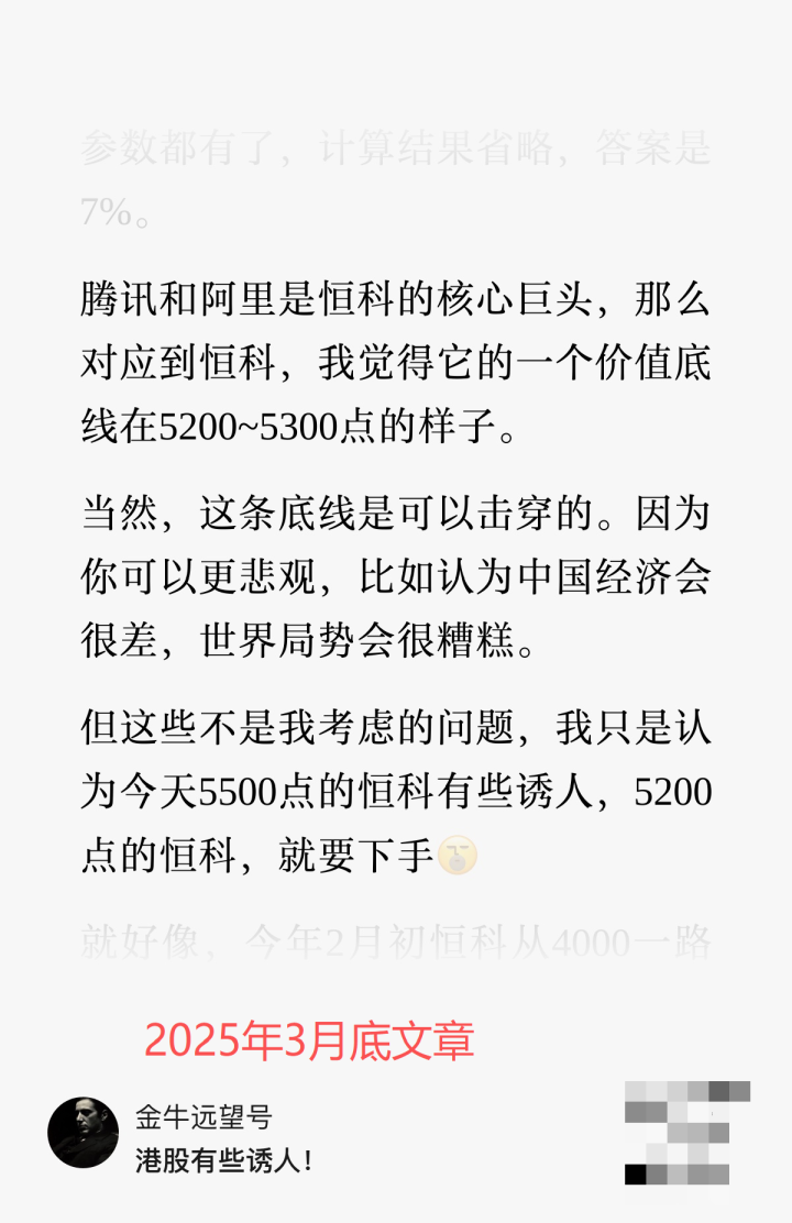 3月底,随着市场情绪下降,港股科技又跌回到5000多点,很多投资者开始慌。我当时的文章观点如下图——认为5200点是一个价值底线。如果跌到,值得加仓。